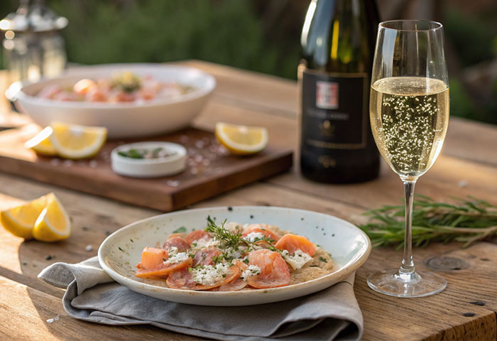 - 白胡椒香るシーフードカルパッチョ: 薄切りの白身魚やホタテに白胡椒を振りかけ、オリーブオイルとレモンを添える一皿は、スパークリングワインの酸味との相性が抜群。