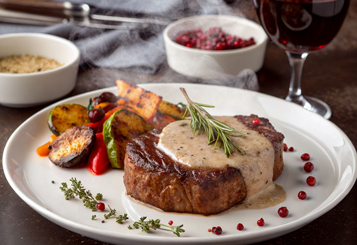 ジューシーなステーキに挽きたてのブラックペッパーを振りかけて、香り高い一皿に仕上げます。この料理のポイントは、仕上げに振るブラックペッパー。挽きたてを使うことで、香りと風味が際立ちます。